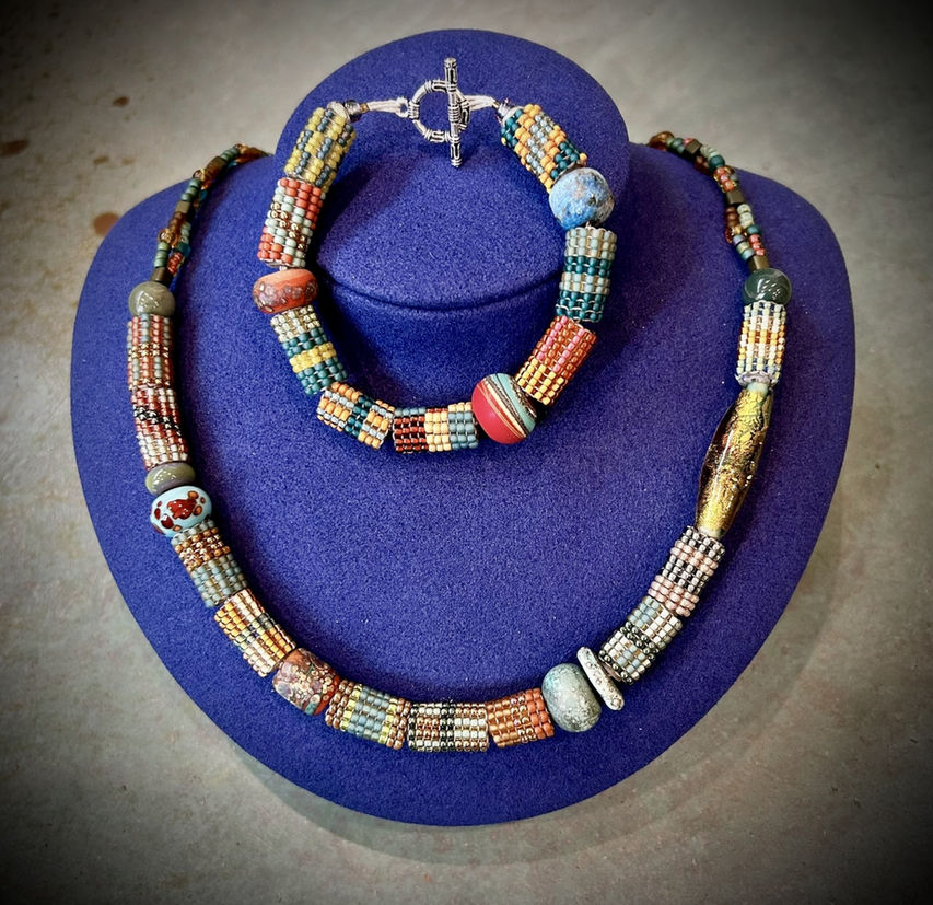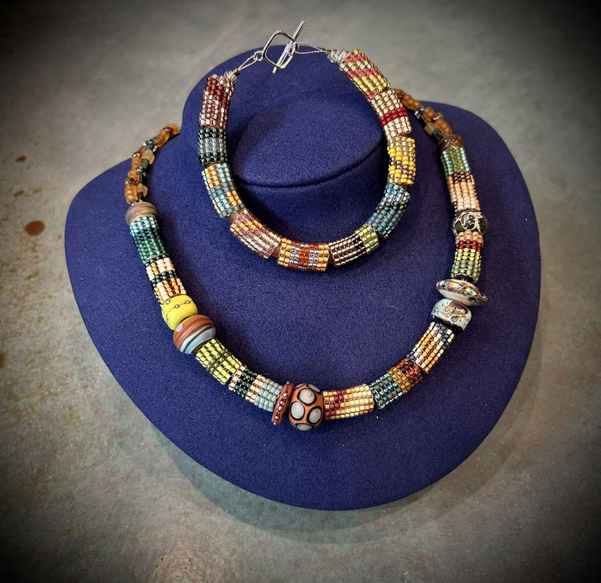 As a child, a real treat was sorting through Grandma’s button jars or collecting interesting rocks from any field or shore. My fascination with combining colors and patterns has continued. I now use tiny seed beads to create beaded cylinders in my attempt to imitate my mother’s beloved Venetian glass necklace. I combine cylinders of various colors and patterns in my necklaces and bracelets, and intersperse beautiful glass lampwork beads to enhance the design.